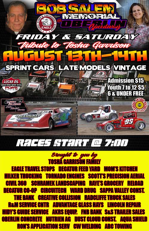 Racing action will take place atop the ?-mile oval of Oberlin Speedway in Oberlin, Kansas on Friday, August 13 and Saturday, August 14. Races are slated to begin at 7PM both nights, with general admission $15 for adults, children ages 7-12 for $5, and children 6 and under free of charge. With the United Rebel Sprint Series sprint cars will be Late Models and Kansas Antique Racers (KAR).